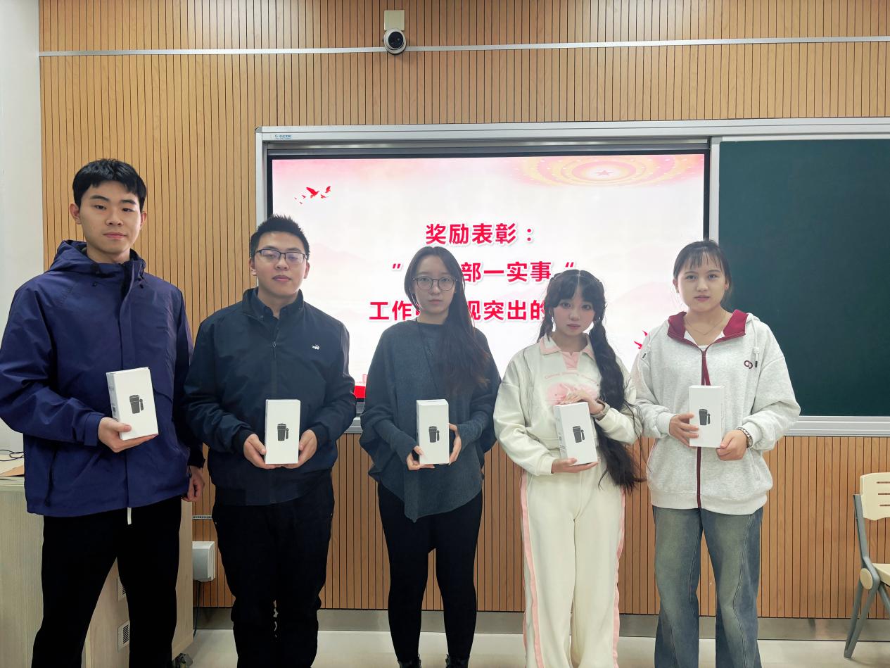 最后,党支部对在“一支部一实事”工作中表现突出的党员进行了表彰,为金佳麒、胡在骐等优秀党员同志颁发了支部准备的精美奖品保温杯,同时勉励其他党员同志以先进为榜样,在未来的学业、科研及工作中保持昂扬斗志奋发向上