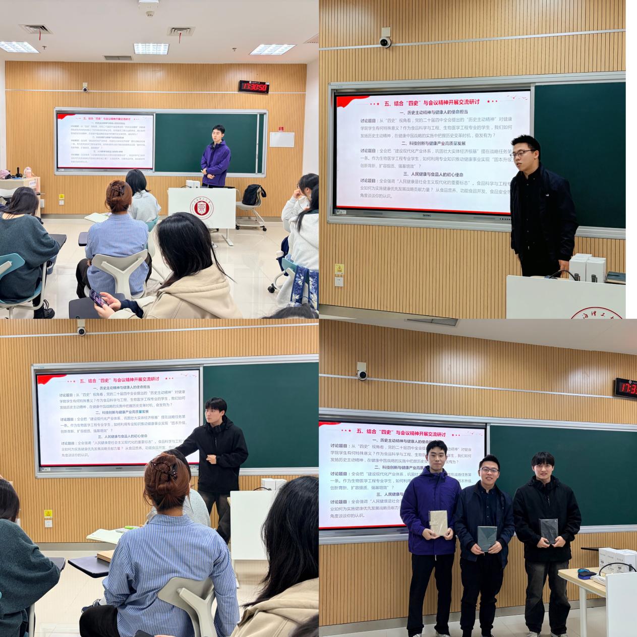 进一步深化理解,学习后开展了无领导小组交流研讨。小组分别围绕“历史主动精神与健康人的使命担当”、“科技创新与健康产业高质量发展”及“人民健康与食品人的初心使命”主题展开热烈讨论。最后分别由小组推选发言人总结小组观点,其中第一小组代表崔宸熙从“四史”角度阐释了历史主动精神,呼吁健康学子把握时代机遇,投身科研提升全民健康;第二小组代表胡在骐则结合专业知识,提出借助生物技术、信息技术推动健康产业高质量发展的具体路径。第三小组代表何旭东则从食品营养、功能食品开发及食品安全等角度踊跃发言,交流见解,现场氛围积极活跃。小组讨论及发言结束后,党支部书记根据小组讨论情况、发言表现为优秀代表颁发了纪念品。