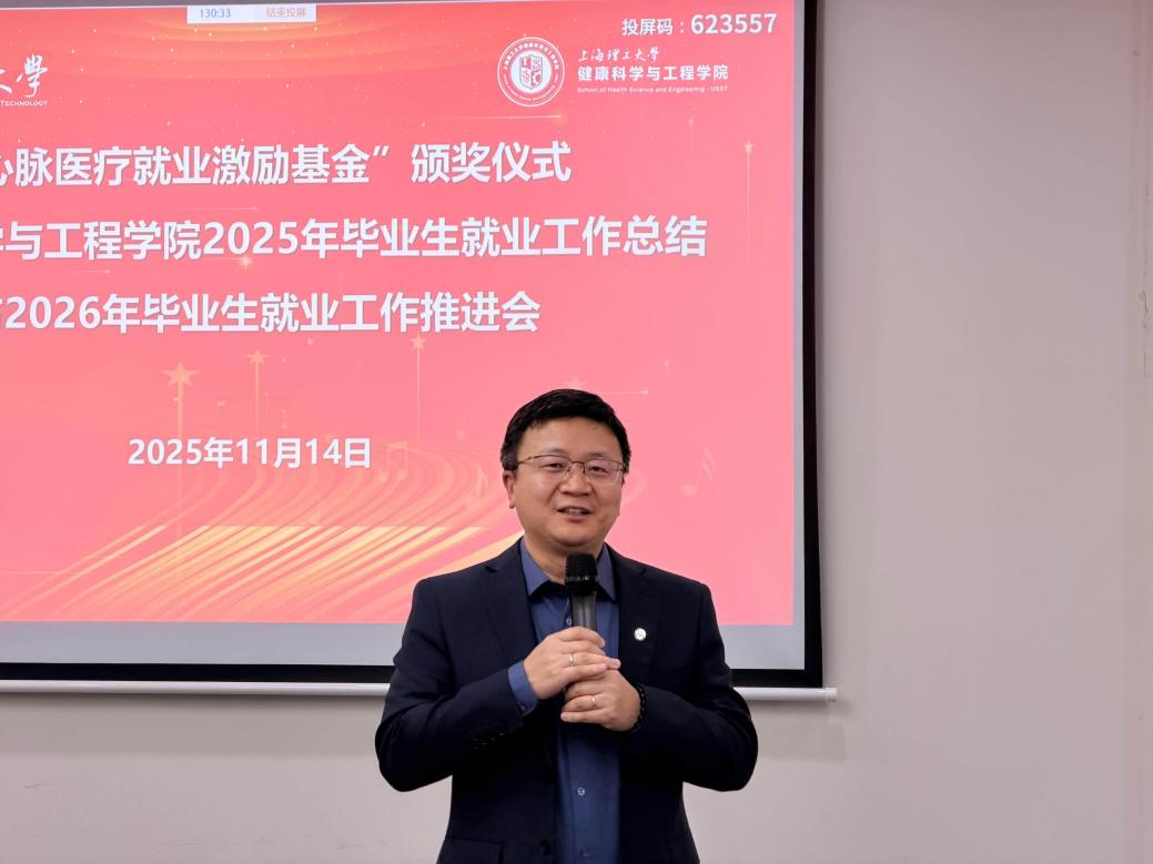 李陈财通报了学院2025届毕业生就业落实情况和2026届毕业生就业意向等基本情况,分析了当前就业形势。他强调要继续做好2025届未就业员工的继续关心与帮扶工作,有针对性的做好2026届毕业生的就业引导、充分发挥就业育人功能;要做细做实“一生一策”,构建系主任、专业负责人、导师、班主任、辅导员等多方协同格局;要深化“访企拓岗”行动,拓宽就业渠道与质量。他还介绍了“心脉医疗就业激励基金”情况,宣读了2025年心脉医疗就业激励基金获奖名单。